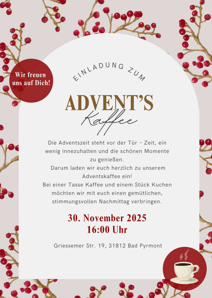 Du bist herzlich zu unserem Adventskaffee am 30.11.2025 um 16:00 Uhr in unseren Räumlichkeiten eingeladen!